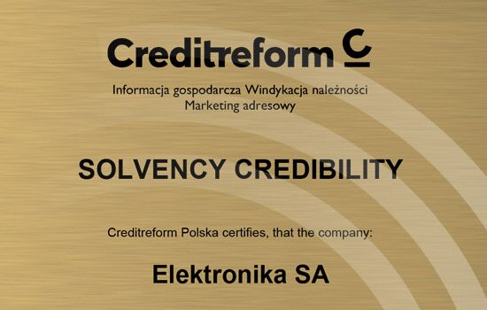 According to the analysis prepared by the international business information agency Creditreform on January 2022, Elektronika SA was granted the Insolvency Index amounting to: 228- good payment capability