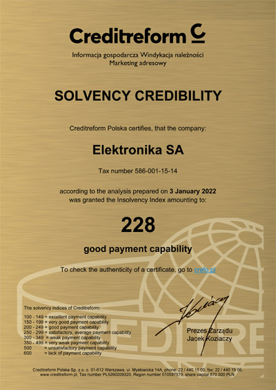 According to the analysis prepared by the international business information agency Creditreform on January 2022, Elektronika SA was granted the Insolvency Index amounting to: 228- good payment capability. Creditreform confirmed the high financial liquidity of the company, the ability to meet financial obligations on time.