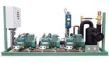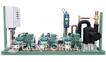 Multi-compressor condensing units based on hermetic piston and scroll compressors from Danfoss, semi-hermetic single/double-stage piston and screw compressors from Frascold and Bitzer, along with components from European manufacturers of refrigeration equipment, including Danfoss, Ziehl-Abegg, GVN, and other components.