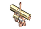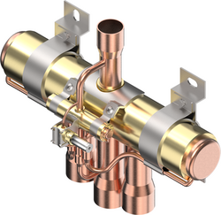 Ряд 4-ходових клапанів Danfoss для зміни напрямку потоку. Клапани керуються пілотним управлінням і здійснюють зміну режиму циклу охолодження. Влітку вони переводять холодильну систему у режим охолодження, а взимку - у режим обігріву. Реверс циркуляції ініціюється невеликим електромагнітним клапаном керування, який керує рухом повзуна, який змінює напрямок потоку холодоагенту.