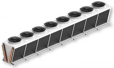Пропозиція включає версії з вертикальним розташуванням вентиляторів в діапазоні номінальної потужності від 52,2 кВт до 720,7 кВт. V-подібний ламельний блок забезпечує високу ефективність конденсатора, оптимізує потік повітря та використання простору.